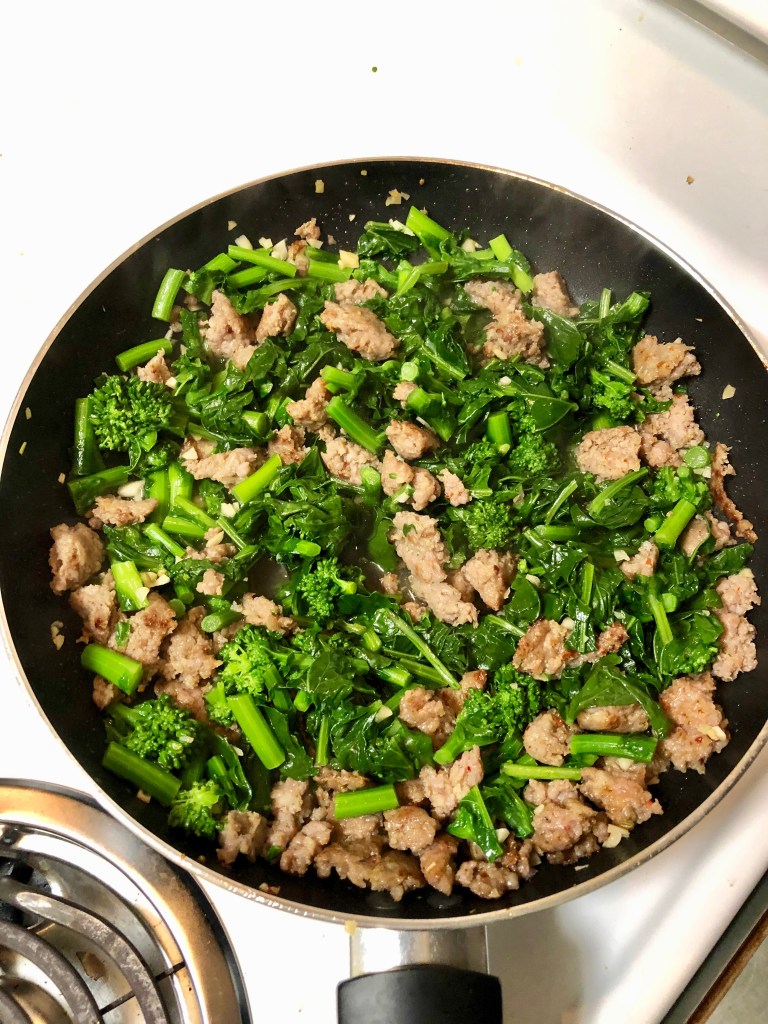 - Heat 2 tbsp of olive oil in a large skillet over medium-high heat. Add sausage, breaking it apart as it cooks. Once it is mostly cooked through, add garlic until fragrant and keep pan on low heat (see Note 2).