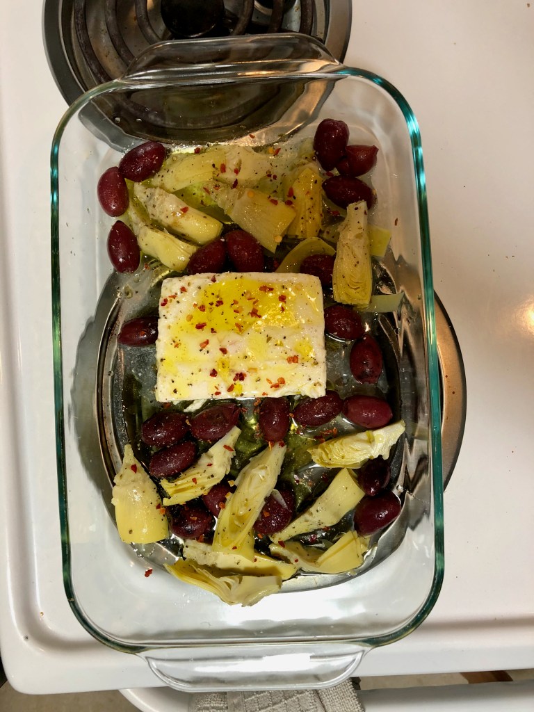 Baked Feta Cheese with Olives, Lemon, and Artichoke Hearts
