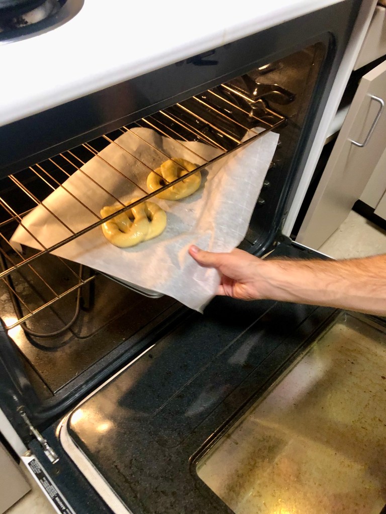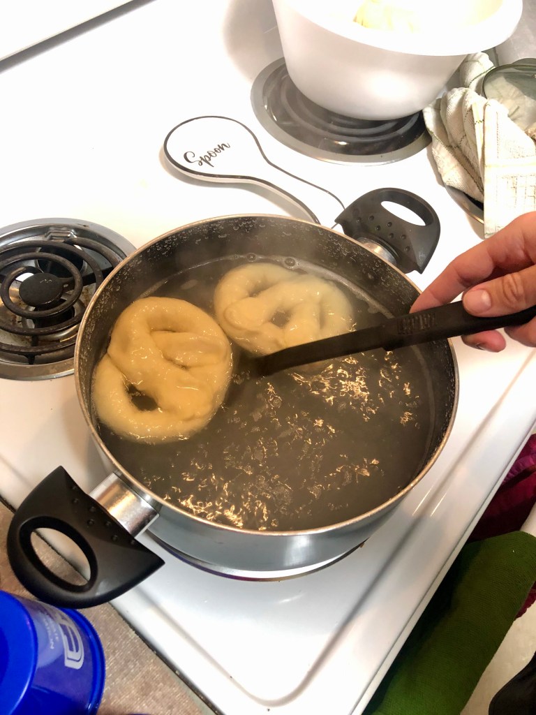 - Place the pretzels into the boiling water, 1 by 1, for 30 seconds. Remove them from the water using a large flat spatula. At this point, you can freeze pretzels to eat at another time, just let thaw for 20 minutes before proceeding to step 6.