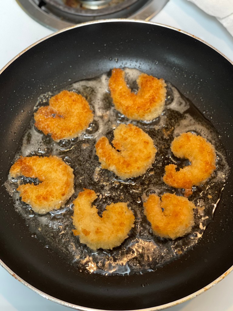 - Dip shrimp into the flour then into the eggs then into the panko breadcrumbs. Transfer to hot oil and fry 2 minutes per side. Remove from oil onto a paper towel lined plate.