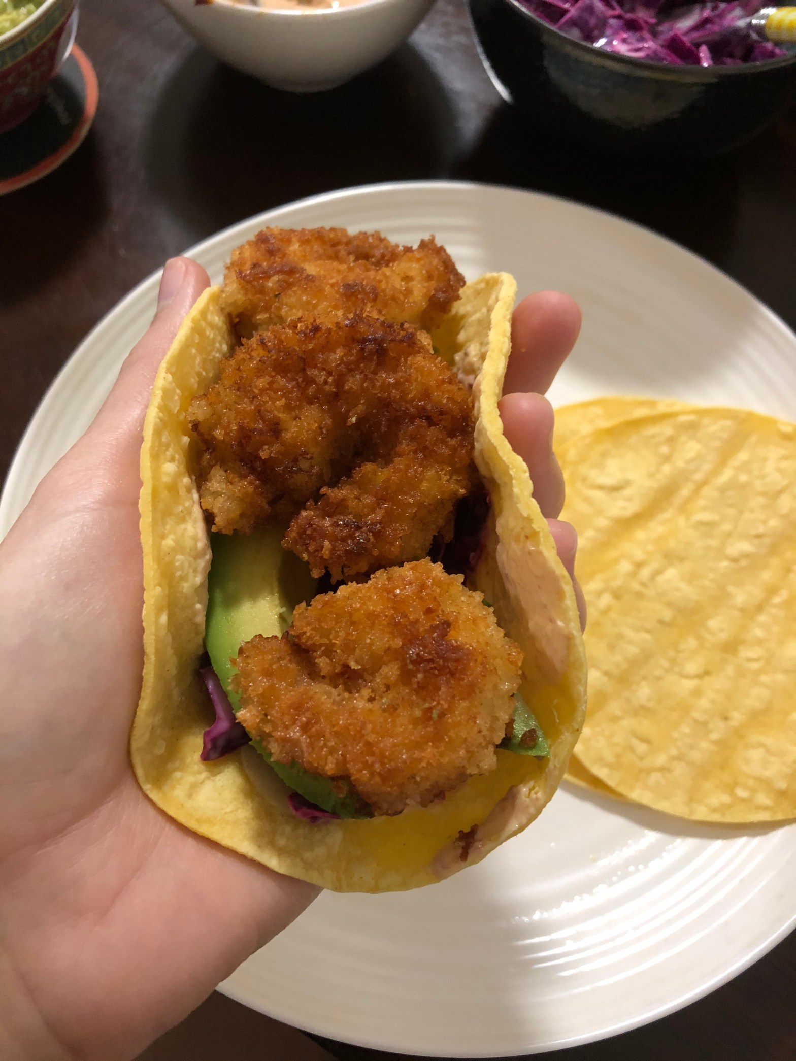 - Place tortillas on a plate and add shredded cabbage to the tortillas along with 3-4 shrimp, a few slices of avocado, and a drizzle of spicy mayo, cilantro lime sauce, or sour cream.