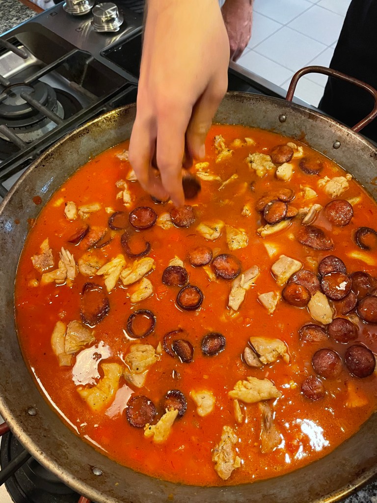 Note 2: I either use 2 ¼ – 2 ½ cups of rice and the 4 cups of broth. Or 4 cups of rice and cut back the broth by about 6 oz., unless you like the paella to be more wet/soupy. This is because I use more shell fish and that creates more water. To make the broth, I take all of the chicken bones, fish scraps, and vegetable scraps and boil until the flavor comes out. If you do not want to do this, you can buy broth. The more flavor, the better.