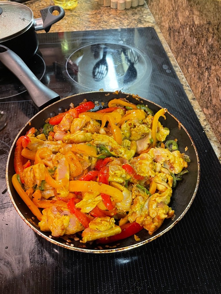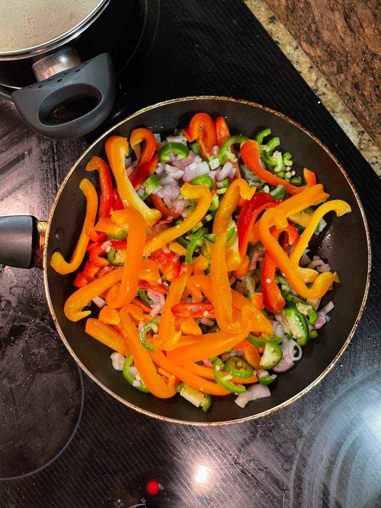 - Heat the oil in a large skillet over medium-high heat. Add the bell peppers, jalapeños, and shallots, cook 2-3 minutes, until the peppers are charring. Stir in the chicken, tossing to combine with the peppers, cook 2 minutes.